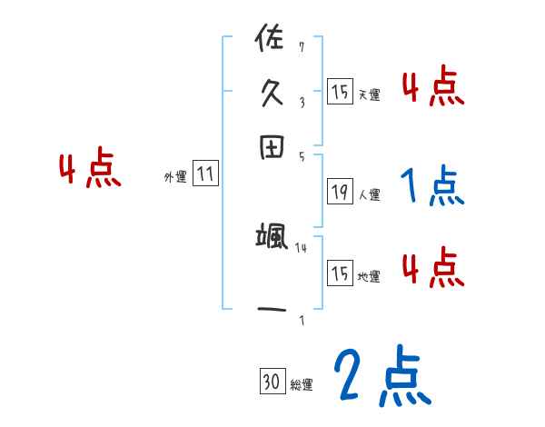| 天運  | 佐久田颯一さんの天運は15画の4つ星!人徳があり出世する。順調に物事を進め円満な人生。家系が持つ宿命的な運勢を表します。祖先から受け継いだ苗字ですので自分の力が及びません。家柄を象徴します。 |