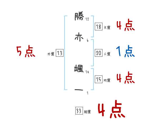 外運![]() | 勝亦颯一さんの外運は13画の5つ星!才能に恵まれ人気がある。名声を手に入れる。円満な人生。 生活面を象徴する運勢です。外部から受ける影響力を表し、結婚運、家庭運や職場、環境への順応性を表します。 |