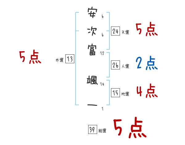 天運![]() | 安次富颯一さんの天運は24画の5つ星!家庭運が良く順調な人生。金運にも恵まれる。 家系が持つ宿命的な運勢を表します。祖先から受け継いだ苗字ですので自分の力が及びません。家柄を象徴します。 |