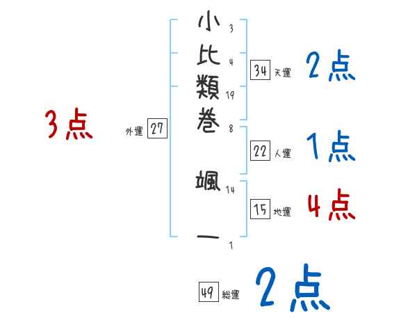 外運![]() | 小比類巻颯一さんの外運は27画の3つ星!頭脳明晰だが強情で摩擦が多い傾向。孤立に注意。 生活面を象徴する運勢です。外部から受ける影響力を表し、結婚運、家庭運や職場、環境への順応性を表します。 |