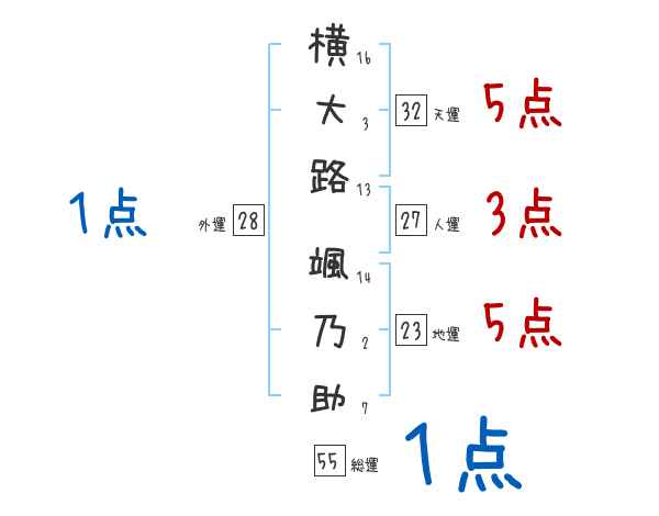 外運![]() | 横大路颯乃助さんの外運は28画の1つ星!家庭環境に注意。スポーツで活躍できる能力があるかも。 生活面を象徴する運勢です。外部から受ける影響力を表し、結婚運、家庭運や職場、環境への順応性を表します。 |