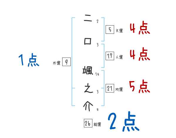 外運![]() | 二口颯之介さんの外運は9画の1つ星!消極的で才能を発揮することが苦手なことも。周りの意見に耳を傾けましょう。 生活面を象徴する運勢です。外部から受ける影響力を表し、結婚運、家庭運や職場、環境への順応性を表します。 |
