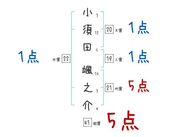 外運![]() | 小須田颯之介さんの外運は22画の1つ星!努力することが苦手ないっぽう手先が器用。芸術性にも優れる。 生活面を象徴する運勢です。外部から受ける影響力を表し、結婚運、家庭運や職場、環境への順応性を表します。 |