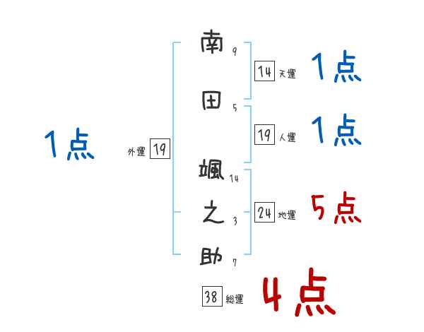 外運![]() | 南田颯之助さんの外運は19画の1つ星!優れた才能を持ちますが、協調性が足りないことも。周りの人と協力する事を意識しましょう。 生活面を象徴する運勢です。外部から受ける影響力を表し、結婚運、家庭運や職場、環境への順応性を表します。 |