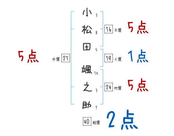 外運![]() | 小松田颯之助さんの外運は21画の5つ星!統率力がある。独立し成功する。名誉を手に入れる。 生活面を象徴する運勢です。外部から受ける影響力を表し、結婚運、家庭運や職場、環境への順応性を表します。 |