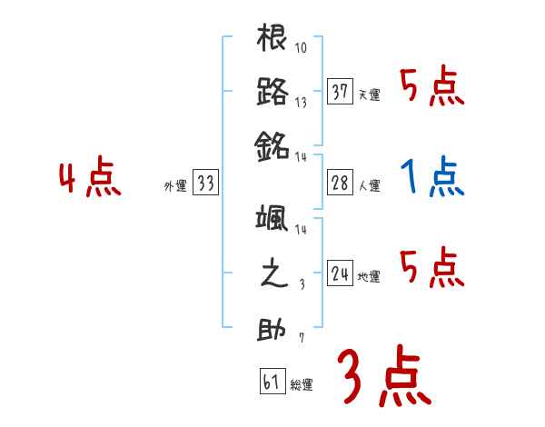 外運![]() | 根路銘颯之助さんの外運は33画の4つ星!権力志向でプライドが高い。勇気があり運を切り開き成功する。 生活面を象徴する運勢です。外部から受ける影響力を表し、結婚運、家庭運や職場、環境への順応性を表します。 |