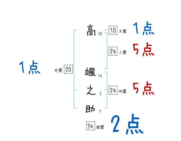 総運![]() | 高颯之助さんの総運は34画の2つ星!独創性に優れるが、自尊心が強く災難に注意しましょう。 あなたの人生を表す1番重要な運勢です。生涯を通じて影響する総合運となり、主に50歳以降の晩年期に影響を及ぼします。 |
