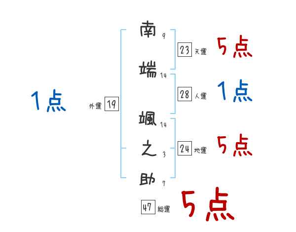 外運![]() | 南端颯之助さんの外運は19画の1つ星!優れた才能を持ちますが、協調性が足りないことも。周りの人と協力する事を意識しましょう。 生活面を象徴する運勢です。外部から受ける影響力を表し、結婚運、家庭運や職場、環境への順応性を表します。 |