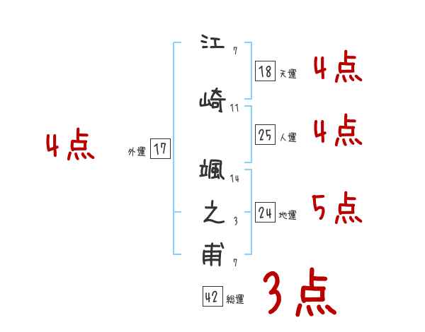 外運![]() | 江崎颯之甫さんの外運は17画の4つ星!積極的な行動力。地位を気づき財産を手に入れる。純粋な心と直感力。 生活面を象徴する運勢です。外部から受ける影響力を表し、結婚運、家庭運や職場、環境への順応性を表します。 |