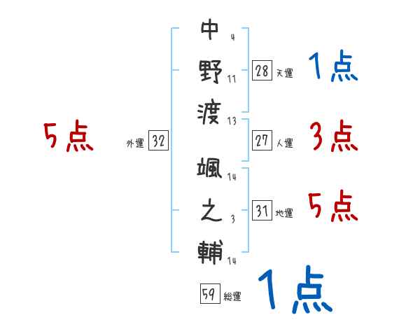 外運![]() | 中野渡颯之輔さんの外運は32画の5つ星!柔軟性があり成功する。チャンスが多く金運が良い。 生活面を象徴する運勢です。外部から受ける影響力を表し、結婚運、家庭運や職場、環境への順応性を表します。 |
