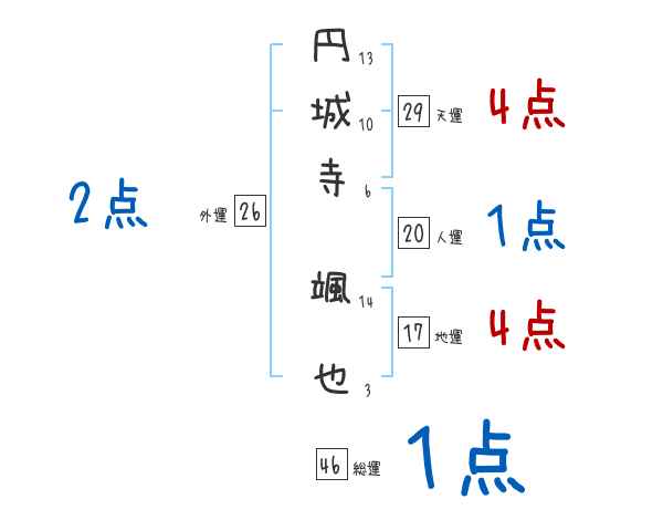 外運![]() | 円城寺颯也さんの外運は26画の2つ星!波瀾万丈かも。信頼できる人を大事にしましょう。 生活面を象徴する運勢です。外部から受ける影響力を表し、結婚運、家庭運や職場、環境への順応性を表します。 |