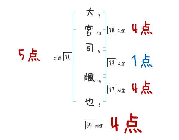 総運![]() | 大宮司颯也さんの総運は35画の4つ星!温厚な性格で感受性が高い。穏和な性格で人望が厚い。 あなたの人生を表す1番重要な運勢です。生涯を通じて影響する総合運となり、主に50歳以降の晩年期に影響を及ぼします。 |