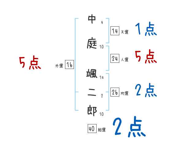 人運![]() | 中庭颯二郎さんの人運は24画の5つ星!家庭運が良く順調な人生。金運にも恵まれる。 性格や才能などを表す2番目に重要な運勢です。人間関係や協調性、社会的な成功に影響します。主に20歳から50歳ぐらいまでの中年期の運勢を表します。 |