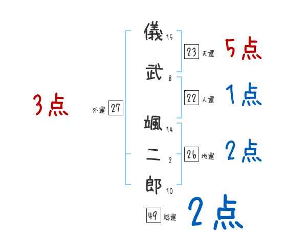 天運![]() | 儀武颯二郎さんの天運は23画の5つ星!想像力に優れ活力がある。一代で成功し名誉を手に入れる。 家系が持つ宿命的な運勢を表します。祖先から受け継いだ苗字ですので自分の力が及びません。家柄を象徴します。 |