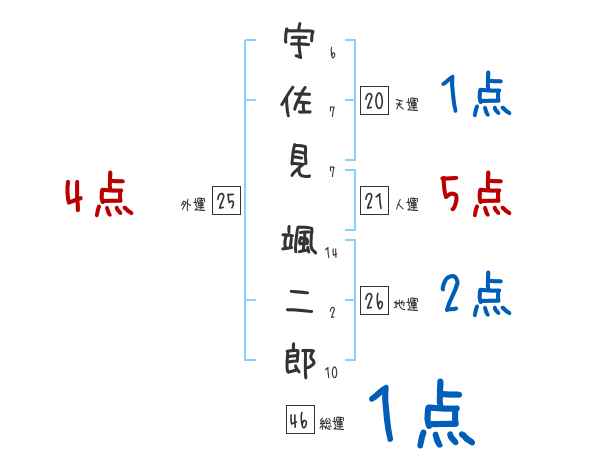 外運![]() | 宇佐見颯二郎さんの外運は25画の4つ星!個性があり才能があふれる。強運の持ち主で発展する。 生活面を象徴する運勢です。外部から受ける影響力を表し、結婚運、家庭運や職場、環境への順応性を表します。 |