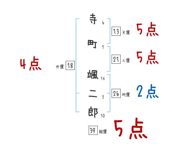 天運![]() | 寺町颯二郎さんの天運は13画の5つ星!才能に恵まれ人気がある。名声を手に入れる。円満な人生。 家系が持つ宿命的な運勢を表します。祖先から受け継いだ苗字ですので自分の力が及びません。家柄を象徴します。 |
