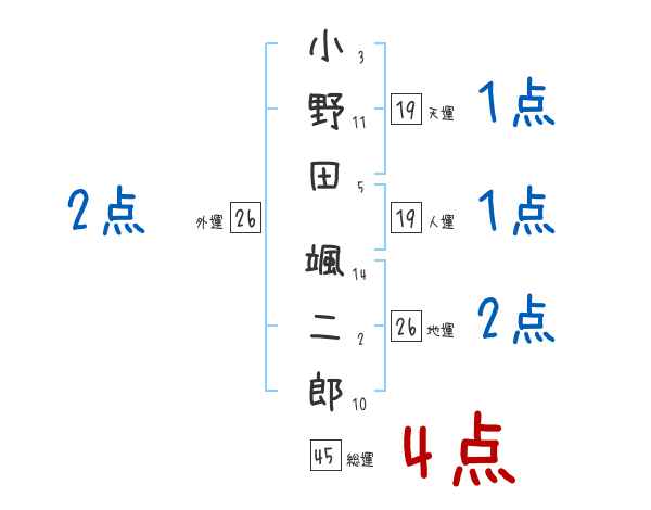 外運![]() | 小野田颯二郎さんの外運は26画の2つ星!波瀾万丈かも。信頼できる人を大事にしましょう。 生活面を象徴する運勢です。外部から受ける影響力を表し、結婚運、家庭運や職場、環境への順応性を表します。 |