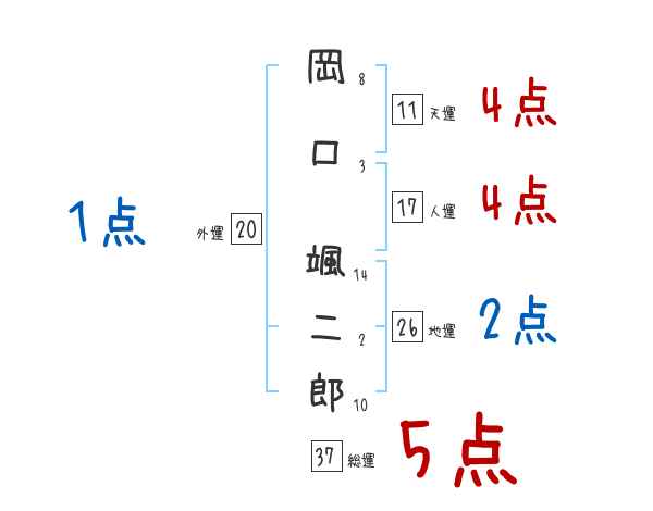 天運![]() | 岡口颯二郎さんの天運は11画の4つ星!着実に富や地位を得る幸運な人生。 家系が持つ宿命的な運勢を表します。祖先から受け継いだ苗字ですので自分の力が及びません。家柄を象徴します。 |