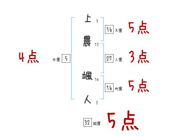 総運![]() | 上農颯人さんの総運は32画の5つ星!柔軟性があり成功する。チャンスが多く金運が良い。 あなたの人生を表す1番重要な運勢です。生涯を通じて影響する総合運となり、主に50歳以降の晩年期に影響を及ぼします。 |