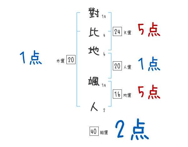 総運![]() | 對比地颯人さんの総運は40画の2つ星!自信過剰で物事に固執するためトラブルに注意。 あなたの人生を表す1番重要な運勢です。生涯を通じて影響する総合運となり、主に50歳以降の晩年期に影響を及ぼします。 |