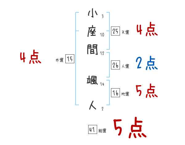 総運![]() | 小座間颯人さんの総運は41画の5つ星!大志を抱き、目標に向かって実力を発揮し達成する。温和な性格。 あなたの人生を表す1番重要な運勢です。生涯を通じて影響する総合運となり、主に50歳以降の晩年期に影響を及ぼします。 |
