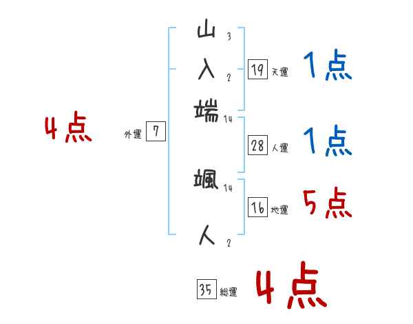 総運![]() | 山入端颯人さんの総運は35画の4つ星!温厚な性格で感受性が高い。穏和な性格で人望が厚い。 あなたの人生を表す1番重要な運勢です。生涯を通じて影響する総合運となり、主に50歳以降の晩年期に影響を及ぼします。 |