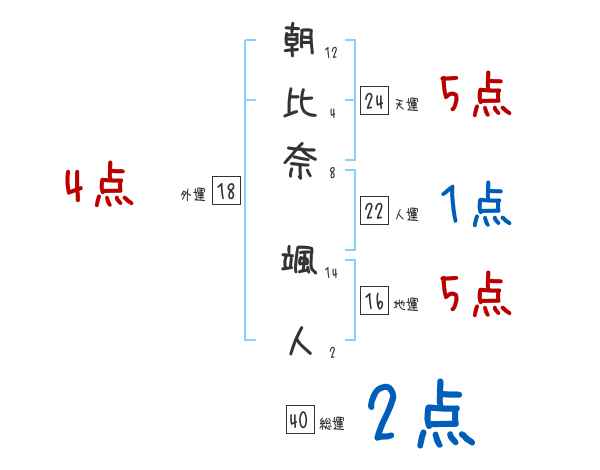 人運![]() | 朝比奈颯人さんの人運は22画の1つ星!努力することが苦手ないっぽう手先が器用。芸術性にも優れる。 性格や才能などを表す2番目に重要な運勢です。人間関係や協調性、社会的な成功に影響します。主に20歳から50歳ぐらいまでの中年期の運勢を表します。 |
