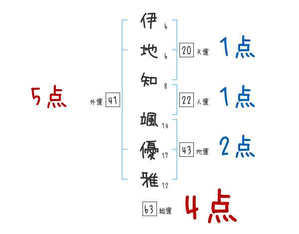 総運![]() | 伊地知颯優雅さんの総運は63画の4つ星!家庭運がよく順調な生活。温和な性格。 あなたの人生を表す1番重要な運勢です。生涯を通じて影響する総合運となり、主に50歳以降の晩年期に影響を及ぼします。 |