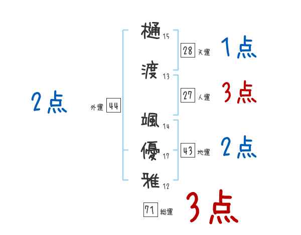 総運![]() | 樋渡颯優雅さんの総運は71画の3つ星!力が弱く小心者だが、いずれ安泰を手に入れる。 あなたの人生を表す1番重要な運勢です。生涯を通じて影響する総合運となり、主に50歳以降の晩年期に影響を及ぼします。 |