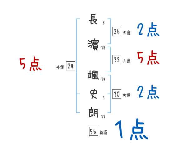 人運![]() | 長濵颯史朗さんの人運は32画の5つ星!柔軟性があり成功する。チャンスが多く金運が良い。 性格や才能などを表す2番目に重要な運勢です。人間関係や協調性、社会的な成功に影響します。主に20歳から50歳ぐらいまでの中年期の運勢を表します。 |