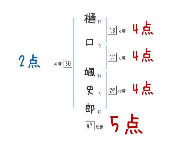 総運![]() | 樋口颯史郎さんの総運は47画の5つ星!実力が開花し発展する円満な人生。財に恵まれる。 あなたの人生を表す1番重要な運勢です。生涯を通じて影響する総合運となり、主に50歳以降の晩年期に影響を及ぼします。 |