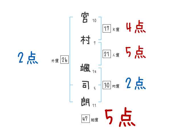 外運![]() | 宮村颯司朗さんの外運は26画の2つ星!波瀾万丈かも。信頼できる人を大事にしましょう。 生活面を象徴する運勢です。外部から受ける影響力を表し、結婚運、家庭運や職場、環境への順応性を表します。 |