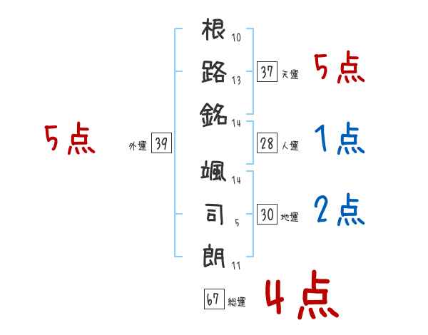 外運![]() | 根路銘颯司朗さんの外運は39画の5つ星!社交性に優れ人望が厚い。人の上に立ち成功する。 生活面を象徴する運勢です。外部から受ける影響力を表し、結婚運、家庭運や職場、環境への順応性を表します。 |