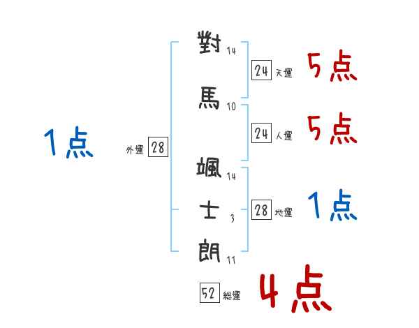 | 外運  | 對馬颯士朗さんの外運は28画の1つ星!家庭環境に注意。スポーツで活躍できる能力があるかも。生活面を象徴する運勢です。外部から受ける影響力を表し、結婚運、家庭運や職場、環境への順応性を表します。 |