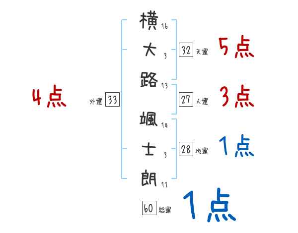 天運![]() | 横大路颯士朗さんの天運は32画の5つ星!柔軟性があり成功する。チャンスが多く金運が良い。 家系が持つ宿命的な運勢を表します。祖先から受け継いだ苗字ですので自分の力が及びません。家柄を象徴します。 |