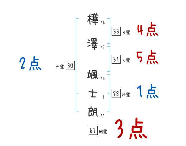 外運![]() | 樺澤颯士朗さんの外運は30画の2つ星!浮き沈みの激しさに注意しましょう。 生活面を象徴する運勢です。外部から受ける影響力を表し、結婚運、家庭運や職場、環境への順応性を表します。 |