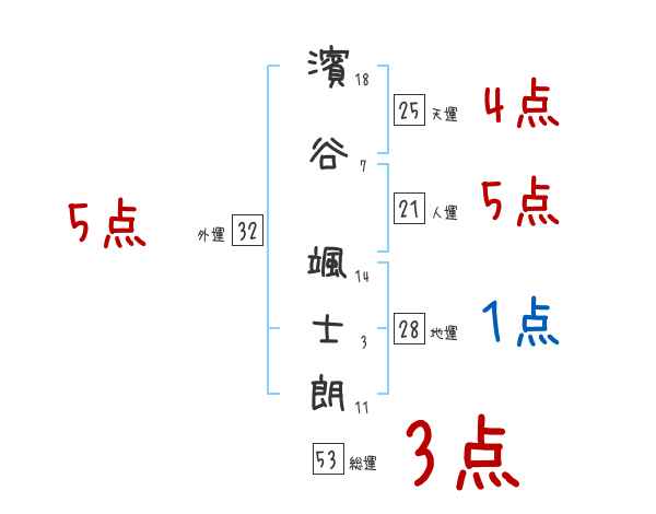 | 外運  | 濱谷颯士朗さんの外運は32画の5つ星!柔軟性があり成功する。チャンスが多く金運が良い。生活面を象徴する運勢です。外部から受ける影響力を表し、結婚運、家庭運や職場、環境への順応性を表します。 |
