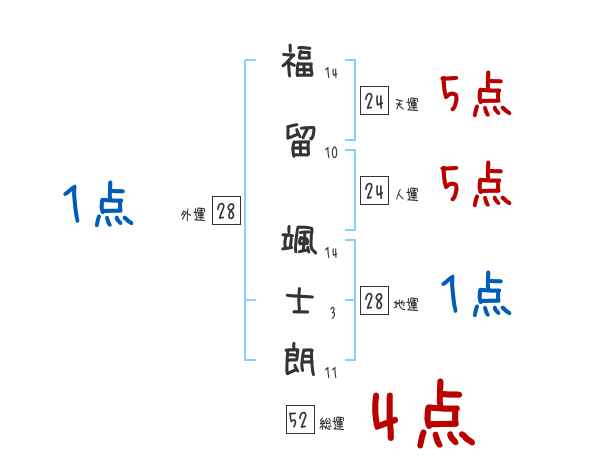 外運![]() | 福留颯士朗さんの外運は28画の1つ星!家庭環境に注意。スポーツで活躍できる能力があるかも。 生活面を象徴する運勢です。外部から受ける影響力を表し、結婚運、家庭運や職場、環境への順応性を表します。 |
