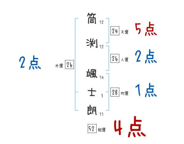 天運![]() | 筒渕颯士朗さんの天運は24画の5つ星!家庭運が良く順調な人生。金運にも恵まれる。 家系が持つ宿命的な運勢を表します。祖先から受け継いだ苗字ですので自分の力が及びません。家柄を象徴します。 |