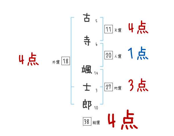 天運![]() | 古寺颯士郎さんの天運は11画の4つ星!着実に富や地位を得る幸運な人生。 家系が持つ宿命的な運勢を表します。祖先から受け継いだ苗字ですので自分の力が及びません。家柄を象徴します。 |