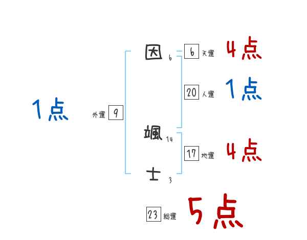 外運![]() | 因颯士さんの外運は9画の1つ星!消極的で才能を発揮することが苦手なことも。周りの意見に耳を傾けましょう。 生活面を象徴する運勢です。外部から受ける影響力を表し、結婚運、家庭運や職場、環境への順応性を表します。 |