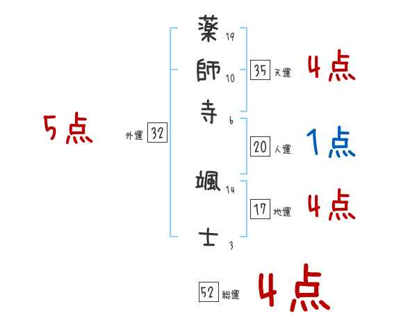 天運![]() | 薬師寺颯士さんの天運は35画の4つ星!温厚な性格で感受性が高い。穏和な性格で人望が厚い。 家系が持つ宿命的な運勢を表します。祖先から受け継いだ苗字ですので自分の力が及びません。家柄を象徴します。 |