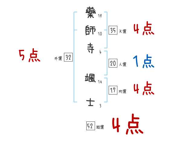 天運![]() | 藥師寺颯士さんの天運は35画の4つ星!温厚な性格で感受性が高い。穏和な性格で人望が厚い。 家系が持つ宿命的な運勢を表します。祖先から受け継いだ苗字ですので自分の力が及びません。家柄を象徴します。 |