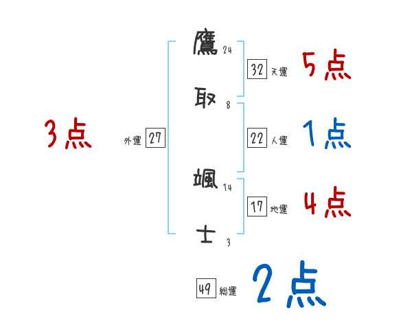 天運![]() | 鷹取颯士さんの天運は32画の5つ星!柔軟性があり成功する。チャンスが多く金運が良い。 家系が持つ宿命的な運勢を表します。祖先から受け継いだ苗字ですので自分の力が及びません。家柄を象徴します。 |