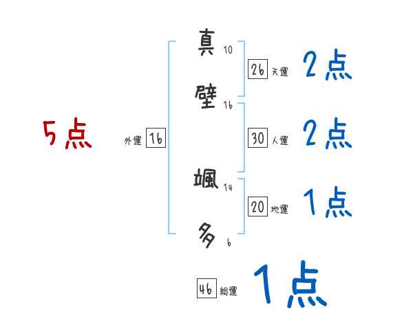 外運![]() | 真壁颯多さんの外運は16画の5つ星!人望が厚く大きく発展する。逆転成功が見える。 生活面を象徴する運勢です。外部から受ける影響力を表し、結婚運、家庭運や職場、環境への順応性を表します。 |