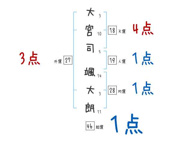天運![]() | 大宮司颯大朗さんの天運は18画の4つ星!情熱的で剛気。忍耐力があり信頼される。 家系が持つ宿命的な運勢を表します。祖先から受け継いだ苗字ですので自分の力が及びません。家柄を象徴します。 |