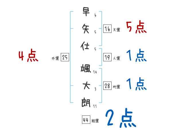 外運![]() | 早矢仕颯大朗さんの外運は25画の4つ星!個性があり才能があふれる。強運の持ち主で発展する。 生活面を象徴する運勢です。外部から受ける影響力を表し、結婚運、家庭運や職場、環境への順応性を表します。 |