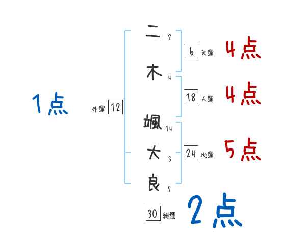 天運![]() | 二木颯大良さんの天運は6画の4つ星!慎重な努力家で信頼を得る。誠実な精神で向上心に優れる。 家系が持つ宿命的な運勢を表します。祖先から受け継いだ苗字ですので自分の力が及びません。家柄を象徴します。 |