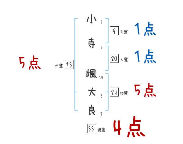 外運![]() | 小寺颯大良さんの外運は13画の5つ星!才能に恵まれ人気がある。名声を手に入れる。円満な人生。 生活面を象徴する運勢です。外部から受ける影響力を表し、結婚運、家庭運や職場、環境への順応性を表します。 |