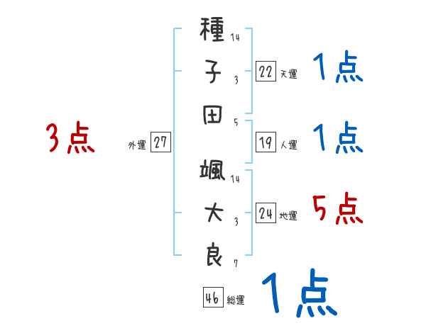 外運![]() | 種子田颯大良さんの外運は27画の3つ星!頭脳明晰だが強情で摩擦が多い傾向。孤立に注意。 生活面を象徴する運勢です。外部から受ける影響力を表し、結婚運、家庭運や職場、環境への順応性を表します。 |